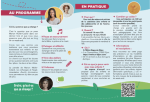 Croire, qu’est-ce que ça change ? C’est la question que se pose Marion Muller-Colard dans son dernier livre et que nous nous poserons avec elle tout au long de ce week-end. Croire non pas comme une évidence que nous pourrions transmettre aux enfants et aux jeunes que nous accompagnons, mais comme un chemin à explorer avec elles et eux. Un chemin sur lequel les doutes et les questionnements ont toute leur place : les leurs et les nôtres. La pensée de Marion Muller-Colard, nos échanges et l’expérimentation d’outils d’animation nous permettront d’y faire un pas de plus.