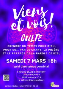 Le premier culte ‘Viens et vois !’ aura lieu le samedi 7 mars à 18h à Sochaux, suivi d’un temps convivial. Ce projet d’église alternative est soutenu par le conseil régional et vise à créer un espace de rencontre, de prière et de partage ouvert à tous.